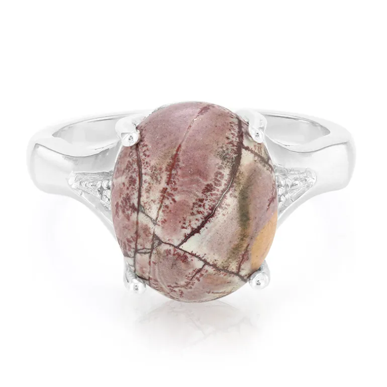 Tauchen Sie ein in die natürliche Schönheit dieses bezaubernden Rings aus 925er Sterlingsilber, der einen ovalen Cabochon aus Sonora Dendritischem Jaspis von 4,18 Karat aus den reichen Landschaften Mexikos präsentiert. Akzentuiert mit zwei Weißtopasen im Brillantschliff aus Brasilien, verbindet dieser Schatz erdige Eleganz und raffinierte Anmut. Dieses einzigartige Schmuckstück, das sowohl zu legerer als auch zu anspruchsvoller Kleidung passt, sorgt bei jeder Veranstaltung für Gesprächsstoff.