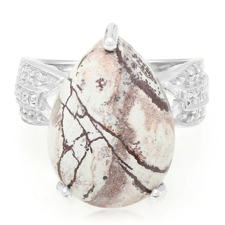 Entdecken Sie die natürliche Schönheit dieses Silberrings aus mexikanischem Sonora-Jaspis. Der tropfenförmige Cabochon mit einem Gewicht von 8,52 Karat ist ein Fest der erdigen Töne und weist einzigartige dendritische Muster auf, die eine Geschichte erzählen, die so alt ist wie die Zeit. Der Ring aus 925er Sterlingsilber mit einem Gewicht von ca. 4,28 g ist mit einer Konstellation von 0,243 ct weißen Topasen aus Brasilien akzentuiert, die ihm einen Hauch von Funkeln verleihen. Perfekt, um Ihrem Alltag einen Hauch von Eleganz zu verleihen oder für besondere Anlässe, die nach einem besonderen Schmuckstück verlangen.