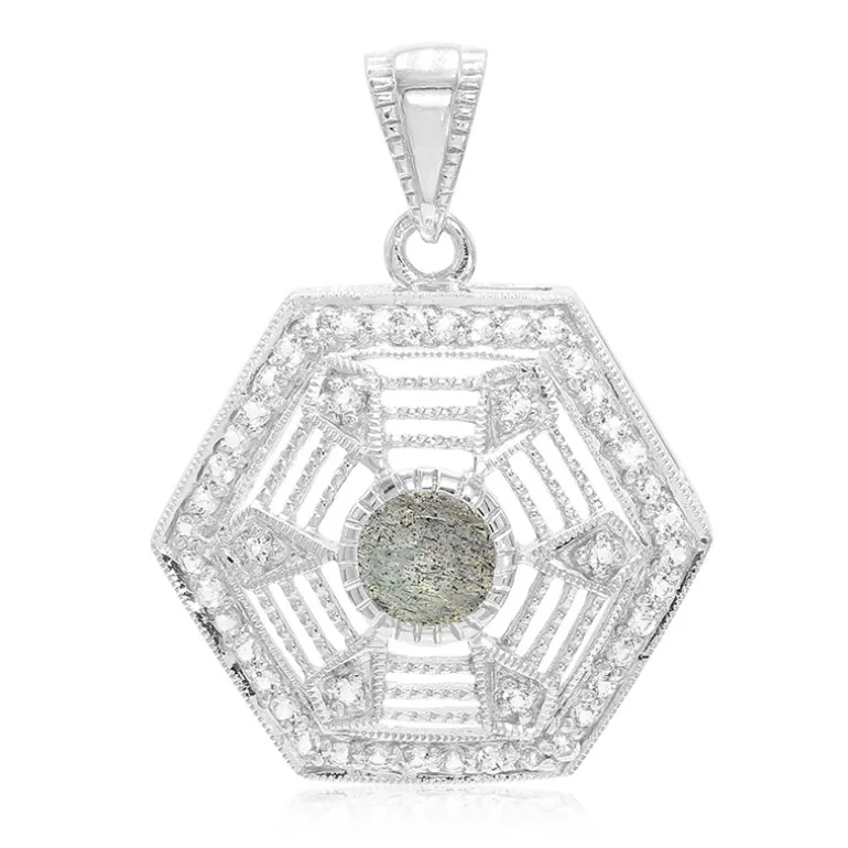 Entdecken Sie den Charme des Spektrolith-Anhängers aus Sterlingsilber. Dieses Schmuckstück zeigt einen faszinierenden Spektrolithen von 0,48 Karat im Rundschliff aus Rumänien, der von 47 weißen Topasen im Brillantschliff aus Brasilien umgeben ist. Das verschlungene Design ist ein fesselnder Blickfang. Er eignet sich sowohl für legere als auch für formelle Anlässe und passt sowohl zur Tages- als auch zur Abendgarderobe und verleiht jedem Outfit einen Hauch von Eleganz.