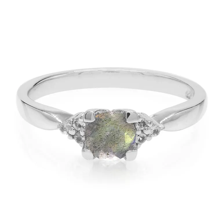 Dieser bezaubernde Ring zeigt einen faszinierenden 0,39-karätigen Spektrolithen aus Rumänien, der von sechs schillernden weißen Topas-Steinen aus Brasilien umgeben ist. Das elegante Design aus 925er Sterlingsilber bringt die Steine im Rundschliff wunderschön zur Geltung. Er ist ideal für besondere Anlässe oder als eleganter Begleiter für den Alltag. Er passt sowohl zu formellen als auch zu legeren Outfits und bietet zeitlose Raffinesse.