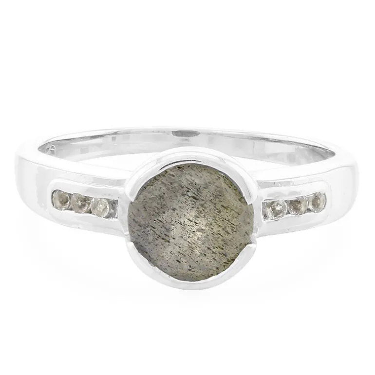 Entdecken Sie den rätselhaften Charme dieses rumänischen Spektrolith-Silberrings, der einen glänzenden 1,235-karätigen Spektrolith mit einem fesselnden Rundschliff präsentiert, der von sechs funkelnden weißen Topasen von insgesamt 0,068-karätig ergänzt wird. Der Ring ist aus hochwertigem 925er Sterling Silber gefertigt und unterstreicht mit seinem schlanken Design die natürliche Schönheit der Edelsteine. Ein vielseitiges Schmuckstück, das sowohl der Freizeit- als auch der Abendgarderobe einen erdigen und doch raffinierten Touch verleiht.