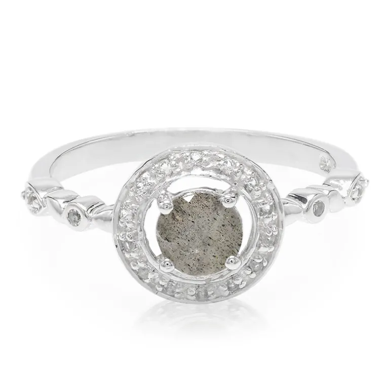 Entdecken Sie die Faszination unseres Spektrolith-Sterlingsilberrings mit einem faszinierenden Spektrolithen im Rundschliff von 0,37 Karat aus Rumänien. Akzentuiert mit einem atemberaubenden weißen Topas aus Brasilien, strahlt dieser Ring Eleganz und Raffinesse aus. Er ist perfekt für jede Gelegenheit und passt sowohl zu Freizeitkleidung als auch zu formellen Anlässen und verleiht Ihrem Ensemble einen Hauch von zeitlosem Charme.