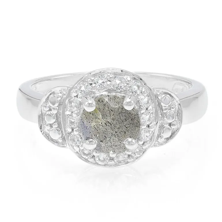 Entdecken Sie die Eleganz dieses atemberaubenden Spektrolith-Rings, der aus Rumänien stammt. Umgeben von 14 weißen Topasen aus Brasilien, bietet dieses Stück aus 925er Sterling Silber ein fesselndes Funkeln. Er eignet sich sowohl für legere als auch für formelle Anlässe und kann mit minimalistischen Outfits kombiniert werden, um seinen einzigartigen Charme zur Geltung zu bringen. Eine vielseitige Ergänzung für jede Schmucksammlung.