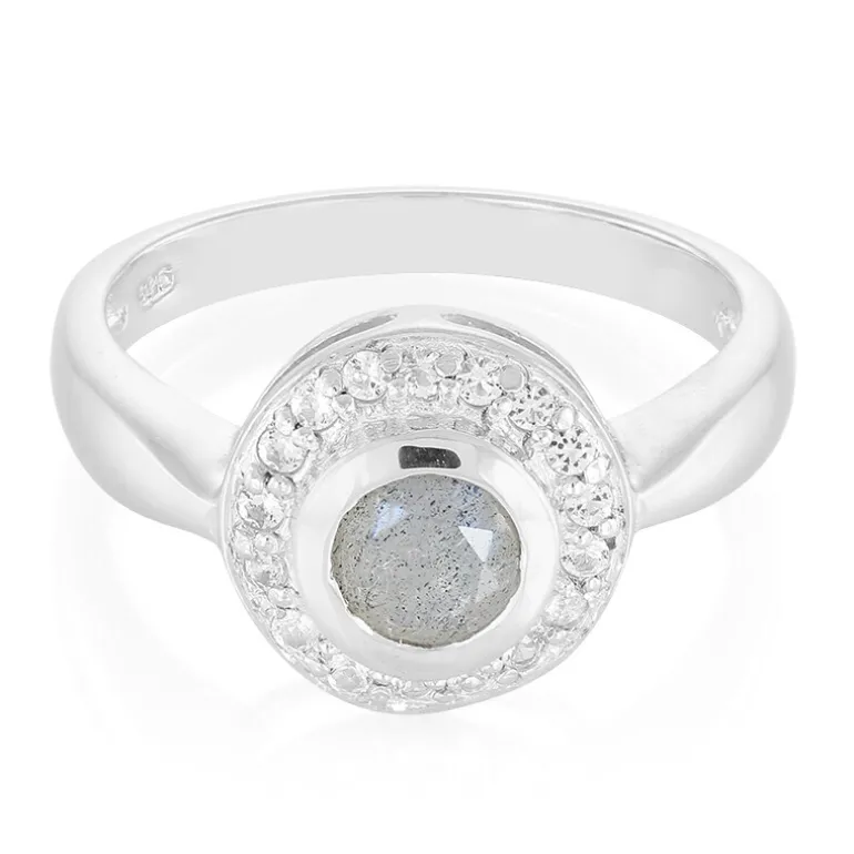 Dieser Ring glänzt mit einem rumänischen Spektrolith von 0,33 Karat im Rundschliff, der von einem Halo aus 17 funkelnden weißen Topasen aus Brasilien akzentuiert wird. Das aus hochwertigem 925er Sterling Silber gefertigte Schmuckstück wiegt ca. 3,22 g und bietet subtile Raffinesse. Dieser Ring ist ideal, um sowohl Tages- als auch Abendgarderobe einen Hauch von Glanz zu verleihen und steht für Eleganz mit einem modernen Touch.
