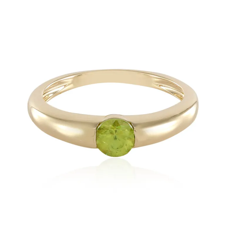 Ein Hauch von Frühling schmückt Ihre Hand mit diesem Ring aus 9 Karat Gold mit einem leuchtenden 0,513 Karat Madagaskar Sphen, auch bekannt als Titanit. Der rund geschliffene Edelstein ist das Herzstück dieses eleganten Designs, das den einzigartigen grünen Farbton im warmen Glanz von etwa 2,38 Gramm Gelbgold hervorhebt. Dieses raffinierte Schmuckstück ist ideal, um der alltäglichen Eleganz einen Farbakzent zu verleihen oder ein abendliches Ensemble zu ergänzen.