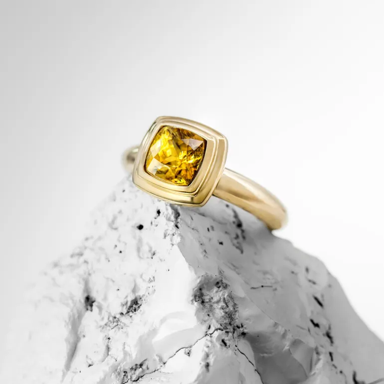 Entdecken Sie die Anziehungskraft dieses charmanten Rings aus 375er Gelbgold, gekrönt von einem 1,23-karätigen brasilianischen Sphen im antiken Kissenschliff. Der leuchtende Farbton des 5,9 mm großen Edelsteins verzaubert jeden Betrachter, während das beachtliche Gewicht des Goldes von 3,4 g ihm eine unbestreitbare Qualität verleiht. Dieser lebendige Ring ist ideal, um jedem Outfit einen Hauch von Vintage-Eleganz zu verleihen. Er ist die perfekte Wahl für besondere Anlässe oder als luxuriöses Alltags-Accessoire.