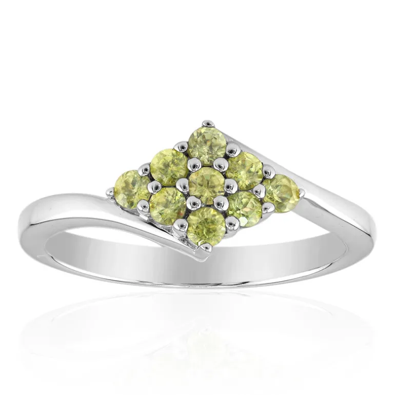 Dieser schicke Ring aus Sterlingsilber, der für zusätzlichen Glanz plattiert ist, enthält neun lebhafte Sphene aus Sri Lanka mit einem Gesamtkaratgewicht von 0,332ct. Die modern gestalteten Edelsteine sind meisterhaft in runde Formen geschliffen, die jeweils etwa 2 mm groß sind, und sorgfältig in einem stilvollen Muster auf dem Ring angeordnet. Dieser Ring eignet sich perfekt, um Alltagsoutfits einen Farbakzent zu verleihen oder Abendgarderobe zu akzentuieren. Er ist eine vielseitige Ergänzung für jede Schmucksammlung.