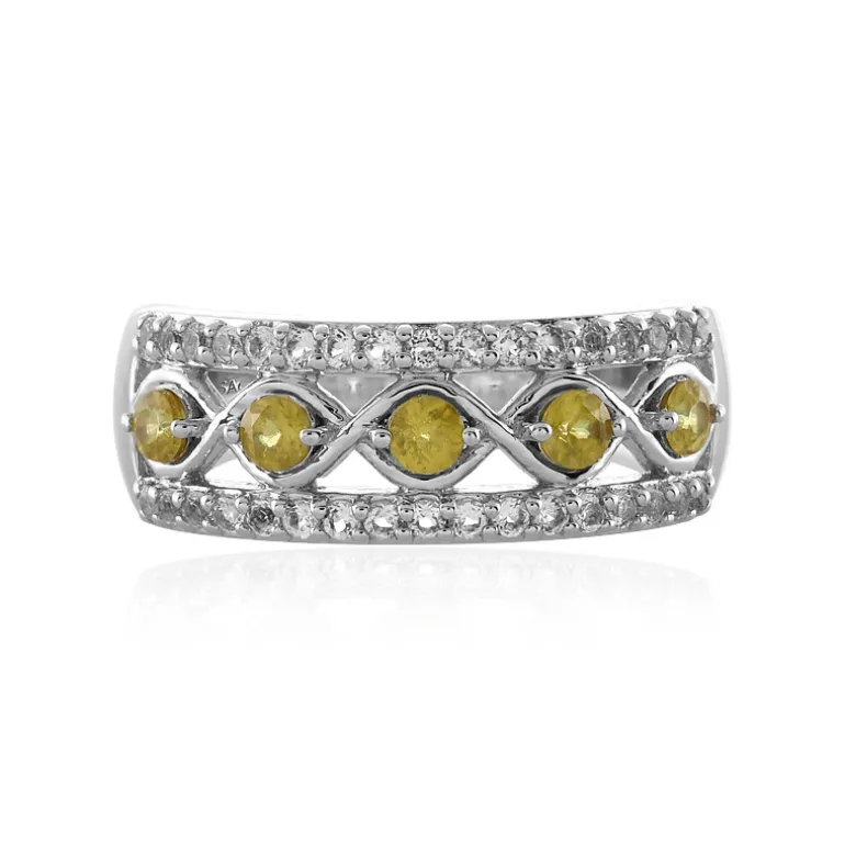 Entdecken Sie die leuchtende Schönheit unseres handgefertigten Rings mit fünf brasilianischen Sphenen im Rundschliff mit einem Gesamtgewicht von 0,336 ct, die inmitten einer funkelnden Reihe von vierunddreißig weißen Topasen mit einem Gesamtgewicht von 0,347 ct gefasst sind. Der aus 925er Sterlingsilber gefertigte Ring wiegt ca. 2,65 g und hat ein verschlungenes Design von 21 x 21 mm. Der zarte Farbkontrast und der moderne Stil machen ihn zu einem idealen Accessoire sowohl für legere als auch für gehobene Kleidung und verleihen jedem Tag einen Hauch von Eleganz.