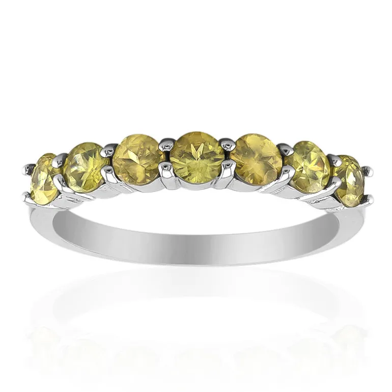 Entdecken Sie die lebendige Anziehungskraft unseres Luminous Sri Lankan Sphene Ringes mit sieben schillernden Sphenen im Rundschliff von insgesamt 0,745 Karat, die sorgfältig in platiniertes 925er Sterlingsilber gefasst sind. Die leuchtenden Goldtöne der Sphene kontrastieren wunderbar mit dem kühlen Glanz des Silbers und machen den Ring zu einem echten Blickfang. Dieser Ring eignet sich sowohl für zwanglose Verlobungen als auch für besondere Anlässe und ist eine vielseitige Ergänzung Ihrer Schmucksammlung. Kombinieren Sie ihn mit Erdtönen, um seine Wärme zu betonen, oder mit kontrastierenden Farben für einen auffälligen Effekt.
