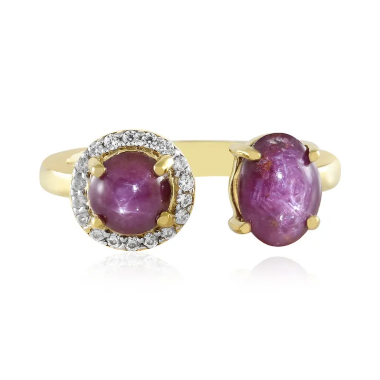 Entdecken Sie die Faszination dieses atemberaubenden Rings mit Sternrubinen aus Madagaskar im Cabochon-Schliff, eingefasst in vergoldetes 925er Sterlingsilber. Akzentuiert mit kambodschanischen Zirkonsteinen, kombiniert dieses Stück Eleganz mit einem Hauch von Glamour. Er ist perfekt für den Abend oder besondere Anlässe und passt sowohl zu formellen als auch zu legeren Outfits und verleiht jedem Look einen strahlenden Touch.