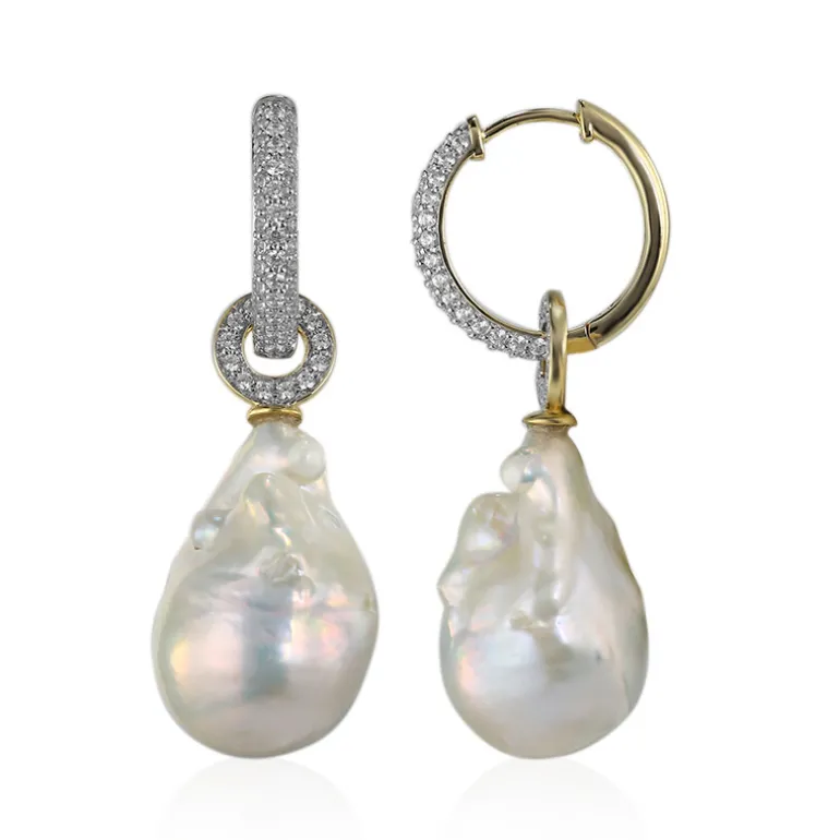 Entdecken Sie die Faszination dieser raffinierten Ohrringe, die schillernde chinesische Süßwasserperlen in einer einzigartigen Fantasieform präsentieren. Diese eleganten Stücke sind mit 112 funkelnden Zirkonen im Rundschliff aus Kambodscha besetzt, die insgesamt 1,12 Karat ausmachen. Jede Perle baumelt anmutig an einem Ring aus 9-karätigem Gold, der mit funkelnden Zirkonen verziert ist und bei jeder Drehung einen hypnotisierenden Tanz des Lichts erzeugt. Mit einem Gewicht von ca. 3,55 Gramm sind diese 38 mm großen Ohrringe der Inbegriff von Finesse und Erhabenheit und eignen sich perfekt für Abendgalas oder als glamouröser Akzent für Ihr Geschäftsoutfit.