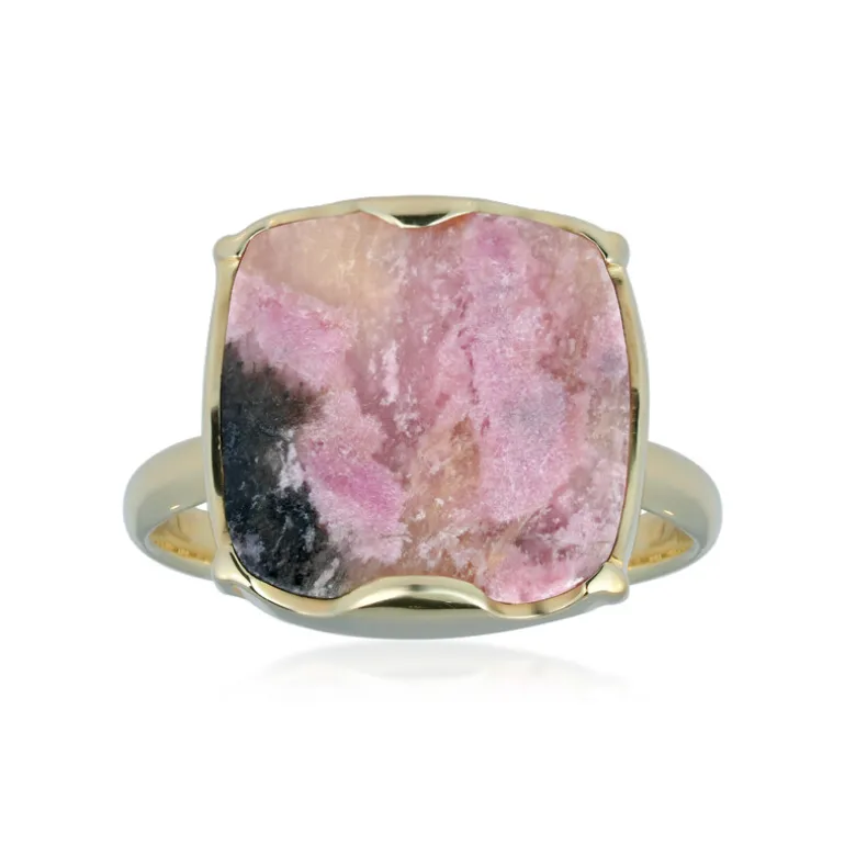 Dieser leuchtende Ring aus vergoldetem 925er Sterlingsilber enthält einen einzigartigen indonesischen Sulawesi-Rhodonit von 9,5 Karat im Kissenschliff, der durch seine sanften Rosatöne in Kombination mit auffälligen Schwarztönen besticht. Der exquisite, 15 mm große, antike Kissen-Cabochon ist in einer eleganten Fassung gefasst, die dafür sorgt, dass dieses Schmuckstück als Zeugnis der Eleganz hervorsticht. Perfekt, um Ihrem Outfit einen Hauch von Vintage-Raffinesse zu verleihen, ob bei der Arbeit oder bei einer Gala.