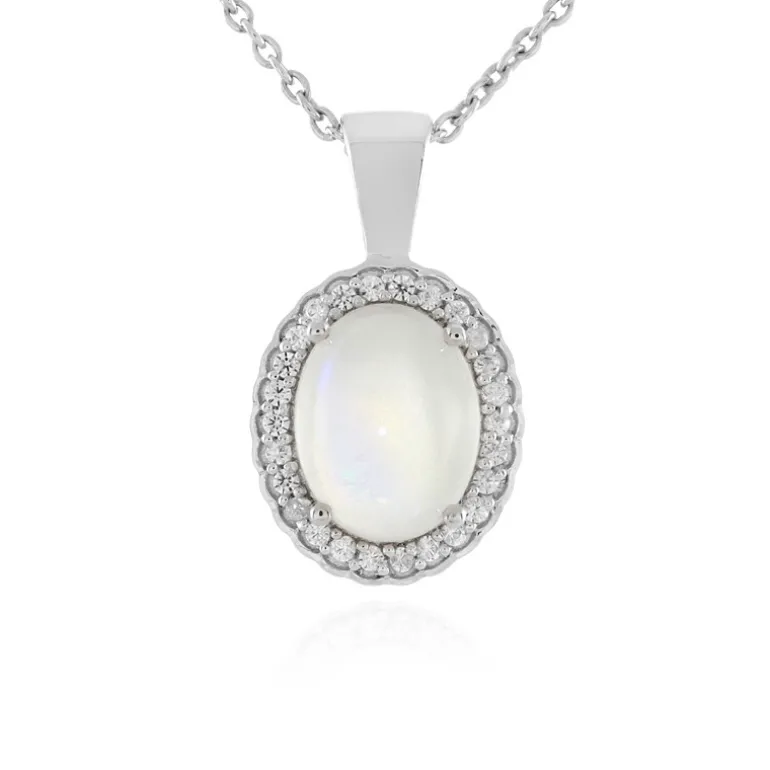 Mit ihrem anmutigen Design ist diese glänzende tansanische Regenbogen-Mondstein-Halskette ein Fest der subtilen Farben. Im Mittelpunkt steht ein ätherischer ovaler Cabochon von 1,575 ct, der von einem Halo aus funkelnden kambodschanischen Zirkonen von insgesamt 0,164 ct umgeben ist und einen zarten Charme versprüht. Der Anhänger ist aus 925er Sterlingsilber gefertigt und wiegt ca. 2,52 g. Er ist eine Studie in Eleganz und Raffinesse. Die 45,5 cm lange Silberkette hat die perfekte Länge, um anmutig am Schlüsselbein zu sitzen, und eignet sich daher sowohl für den Alltag als auch für besondere Anlässe. Verleihen Sie Ihrem Ensemble mit diesem vielseitigen Accessoire einen Hauch von Charme.