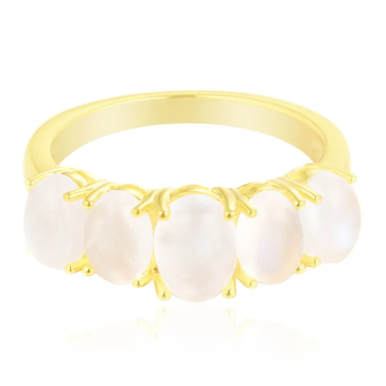 Entdecken Sie die Faszination dieses Rings aus vergoldetem 925er Sterlingsilber mit einem Quintett aus schillernden tansanischen Regenbogen-Mondsteinen mit einem Gesamtgewicht von 2,477 Karat. Die ovalen Cabochon-Steine schimmern in einer Vielzahl von Farben und werden von einem eleganten goldenen Band umschlossen, das für einen modernen Twist sorgt. Dieses vielseitige Accessoire ist perfekt geeignet, um sowohl Tages- als auch Abendgarderobe einen Hauch von Mystik zu verleihen und wird Sie in seinen Bann ziehen.