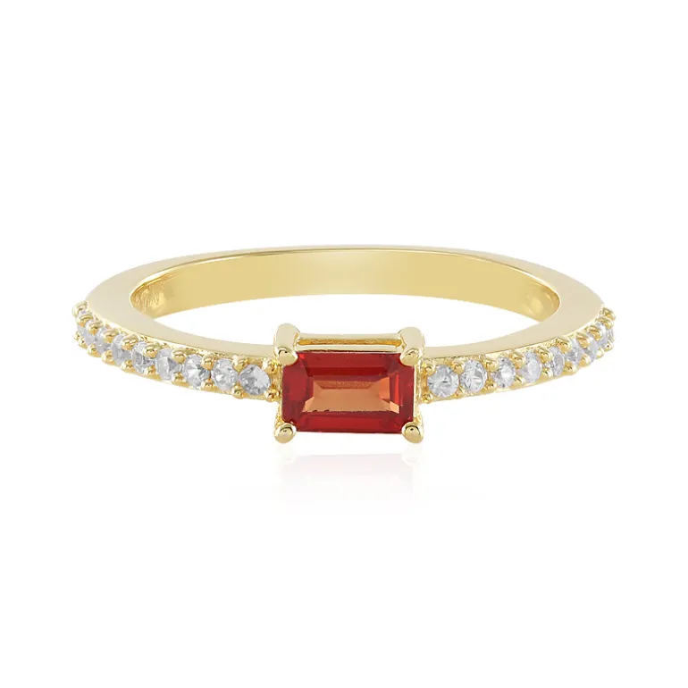 Entdecken Sie die Anziehungskraft dieses atemberaubenden Rings aus vergoldetem 925er Sterlingsilber, der einen lebhaften Rubin aus Tansania von 0,322 Karat mit einem achteckigen Stufenschliff in den Mittelpunkt stellt. Der Ring ist außerdem mit einer Reihe von funkelnden Zirkonen im Rundschliff von insgesamt 0,214 ct aus Kambodscha verziert. Mit einem Edelsteingewicht von insgesamt 0,536 ct strahlt dieser Ring raffinierte Eleganz aus. Er eignet sich perfekt für romantische Abende, besondere Anlässe oder als raffinierter Akzent für Ihr Geschäftsoutfit. Sein warmer goldener Farbton und das satte Rot des Edelsteins sorgen dafür, dass er die Blicke auf sich zieht und zu einer breiten Palette von Farben und Stilen passt.
