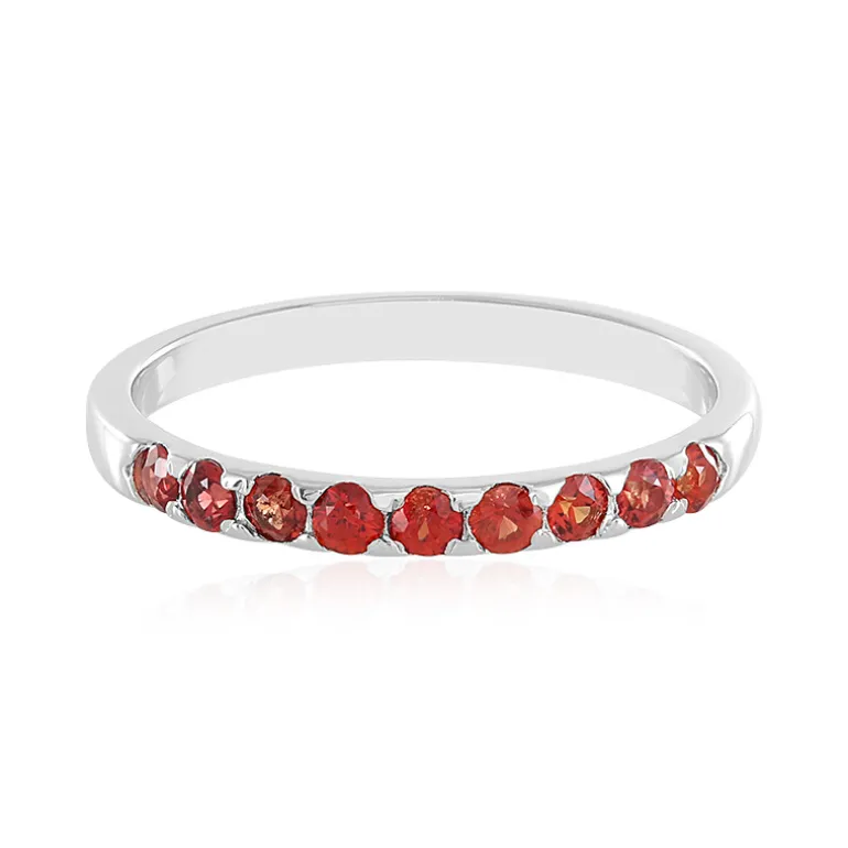 Dieser schimmernde Ring zeigt ein Band aus strahlenden tansanischen Rubinen im Rundschliff von insgesamt 0,475 Karat, die vor einem glänzenden Hintergrund aus 925er Sterlingsilber mit Platinplattierung gefasst sind. Das Design verbindet zeitlose Eleganz mit modernem Charme und passt sowohl zu legeren als auch zu formellen Anlässen. Dieses vielseitige Schmuckstück ist ideal, um die Liebe oder persönliche Meilensteine zu feiern und verspricht, Ihrer Schmucksammlung einen Hauch von satter roter Farbe und Raffinesse zu verleihen.