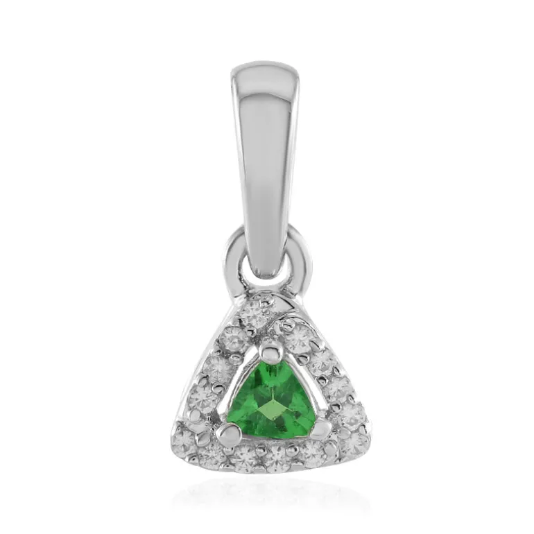 Entdecken Sie den verführerischen Charme unseres schicken tansanischen Tsavorit-Anhängers mit einem leuchtenden Tsavorit im Trillant-Schliff von 0,09 Karat, der in 925er Sterlingsilber eingefasst ist. Der satte grüne Farbton des Edelsteins wird durch 14 funkelnde Zirkone im Rundschliff aus Kambodscha noch zusätzlich betont und verleiht ihm einen Hauch von Glamour. Mit seiner modernen dreieckigen Silhouette ist dieser Anhänger ein vielseitiges Accessoire, das ein Tagesensemble aufwertet oder einem Abendoutfit Raffinesse verleiht. Durch sein geringes Gewicht eignet er sich für den täglichen Gebrauch und ist somit ein ideales Geschenk für einen besonderen Menschen oder eine Freude für Sie selbst.