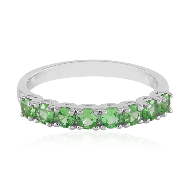 Entdecken Sie die Faszination dieses schicken tansanischen Tsavorit-Silberrings mit acht funkelnden Tsavoriten von insgesamt 0,966 Karat. Jeder Edelstein ist meisterhaft in runder Brillantform geschliffen, um das Licht aus jedem Winkel einzufangen, gefasst in hochwertigem 925er Sterlingsilber mit einer glänzenden Platinoberfläche. Die leuchtenden Grüntöne machen dieses Schmuckstück zu einer auffälligen Ergänzung für jedes Ensemble, perfekt, um Ihrer Alltagskleidung einen Farbtupfer zu verleihen oder ein Outfit für einen besonderen Anlass aufzuwerten. Lassen Sie sich mit diesem exquisiten Ring von der Schönheit der Schätze Tansanias verzaubern.