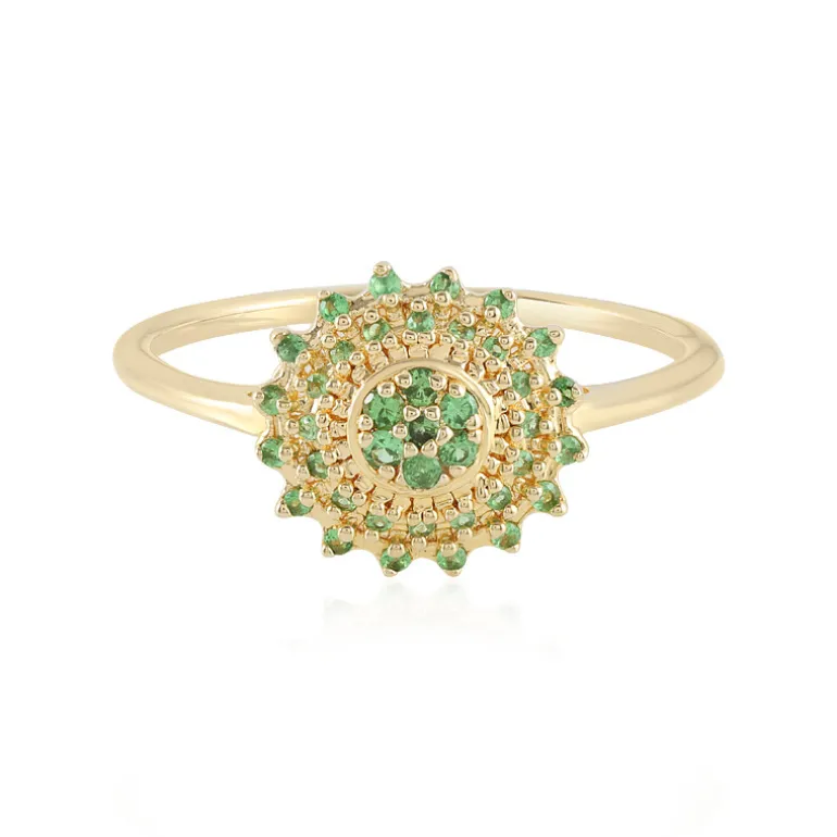 Entdecken Sie die Faszination dieses Rings aus vergoldetem 925er Sterlingsilber, der mit einem schillernden Ensemble aus tansanischen Tsavoriten im Rundschliff von insgesamt 0,315 Karat besetzt ist. Das zentrale Design zeigt ein lebhaftes Sonnenmotiv, das durch die funkelnden Grüntöne dieser atemberaubenden Edelsteine zum Leben erweckt wird. Als perfektes Accessoire für den Tag und den Abend ergänzt es mühelos ein schickes Cocktailkleid oder eine lässige Bluse-Jeans-Kombination. Verschenken Sie ihn an eine geliebte Person oder ergänzen Sie Ihre Schmucksammlung auf elegante Weise.