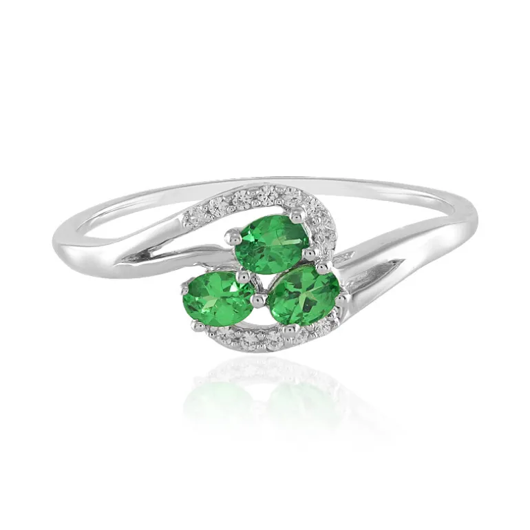 Entdecken Sie die bezaubernde Anziehungskraft dieses Rings aus Sterlingsilber, der drei auffällige Tsavoriten im Ovalschliff aus Tansania mit insgesamt 0,486 Karat präsentiert. Flankiert von schimmernden Zirkonen aus Kambodscha mit insgesamt 0,099 Karat, verbindet dieses Schmuckstück zeitlose Eleganz mit einem Hauch von moderner Raffinesse. Er eignet sich perfekt, um jedem Ensemble einen leuchtenden grünen Farbtupfer zu verleihen, und ist sowohl für zwanglose Ausflüge als auch für besondere Anlässe geeignet. Sein einzigartiges Design sorgt für Gesprächsstoff, und die handwerkliche Verarbeitung garantiert dauerhafte Schönheit.