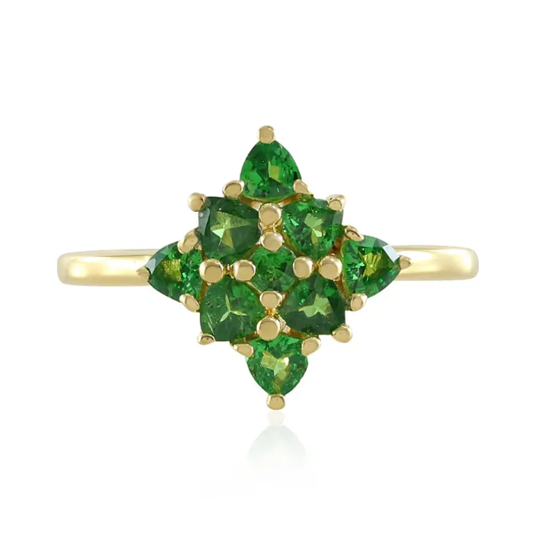 Dieser schicke Ring aus vergoldetem Sterlingsilber, der mit sorgfältig geschliffenen Tsavoriten verziert ist, strahlt die lebendige Essenz Tansanias aus. Mit einem zentralen Cluster aus acht Tsavoriten im Trillant-Schliff von 0,54 ct, ergänzt durch einen Akzent im Rundschliff von 0,054 ct, funkelt dieser Ring mit einem Gesamtgewicht von 0,594 ct. Die 21×19 mm große Ringfläche setzt ein markantes Zeichen, während das schlichte Band einen hohen Tragekomfort im Alltag bietet. Perfekt, um einem legeren Outfit einen Farbakzent zu verleihen oder ein elegantes Abendoutfit zu vervollständigen.
