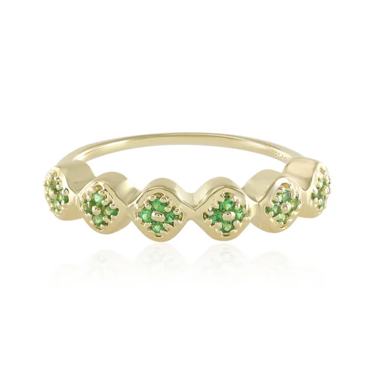 Entdecken Sie die Anziehungskraft dieses zarten Rings, der mit seinem vergoldeten Sterlingsilberband eine Welle reiner Eleganz verkörpert. Das Schmuckstück ist mit 24 tansanischen Tsavoriten im Rundschliff von insgesamt 0,135 Karat besetzt und besticht durch sein strahlend grünes Funkeln. Das schlanke Design mit den Maßen 20×20 mm ist modern und zeitlos zugleich und eignet sich ideal für das tägliche Tragen oder besondere Anlässe. Kombinieren Sie ihn mit einer klassischen weißen Bluse oder einem Abendkleid, um ihm einen eleganten letzten Schliff zu verleihen.