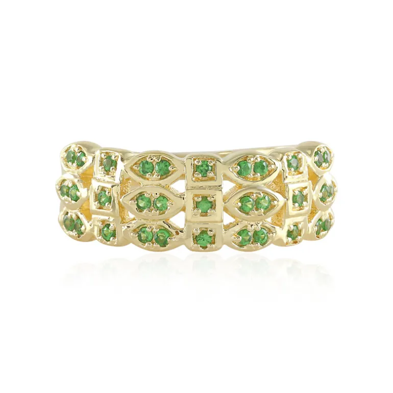 Tauchen Sie ein in das üppige Grün Tansanias mit diesem atemberaubenden Ring, der 33 Tsavoriten im Rundschliff mit einem Gesamtkaratgewicht von 0,207ct zeigt. Das aus 925er Sterlingsilber gefertigte und vergoldete Schmuckstück wiegt etwa 3,5 Gramm. Die verspielte Anordnung der Edelsteine auf dem 20 x 20 mm großen Ring vermittelt einen Hauch von Laune und Eleganz. Kombinieren Sie diesen strahlenden Ring mit Ihrem Lieblingskleid für eine Gartenparty oder eine elegante Abendveranstaltung, um Ihrem Ensemble einen Hauch von Glanz und Vitalität zu verleihen.