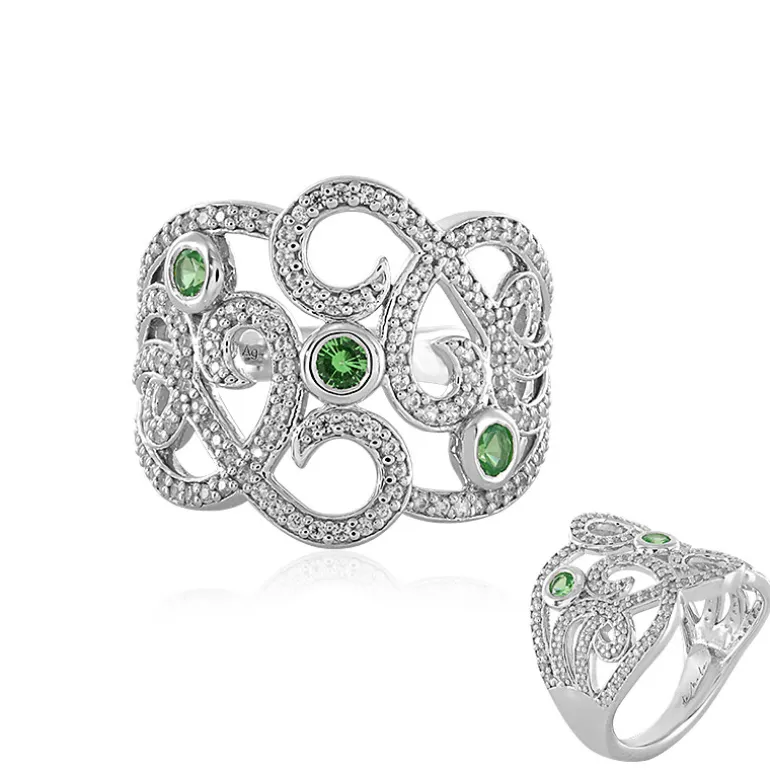 Entdecken Sie die Faszination des Tsavorit mit diesem Ring aus 925er Sterlingsilber, der ein Trio tansanischer Edelsteine im Rundschliff mit einem Gesamtgewicht von 0,352 ct enthält. Inspiriert von der Schönheit der Natur, wird das komplizierte Design durch 148 kambodschanische Zirkonsteine im Rundschliff verstärkt, die mit zusätzlichen 1,028 ct. funkeln. Die silbernen Wirbel vermitteln ein Gefühl der Bewegung, das an eine blühende Blume erinnert. Dieser Ring eignet sich perfekt, um Ihrem Ensemble einen Hauch von grünem Luxus zu verleihen, und ist ein vielseitiges Schmuckstück, das sich mühelos von der Tagesgarderobe bis zur Abendgarderobe tragen lässt.