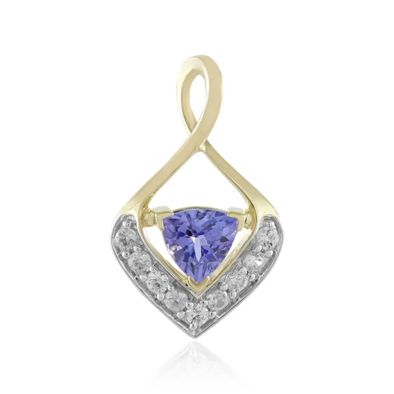 Dieser exquisite Anhänger zeigt einen auffälligen tansanischen Tansanit im Billionen-Schliff von 0,45 Karat, der von neun kambodschanischen Zirkonen wunderschön akzentuiert wird. Dieses elegante Stück aus 375er Gelbgold wiegt 0,51 g und misst 17 x 14 mm. Es ist ideal für besondere Anlässe oder einen raffinierten Alltagslook. Es passt sowohl zu formeller als auch zu legerer Kleidung und verleiht jedem Ensemble einen Hauch von Luxus.