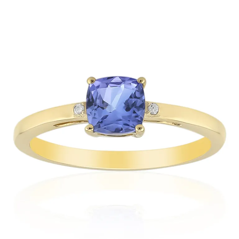 Entdecken Sie die zeitlose Eleganz dieses Rings aus 9 Karat Gelbgold, in dessen Mitte ein tansanischer Tansanit mit antikem Kissenschliff thront. Der Tansanit mit einem Gewicht von 0,477 Karat strahlt einen lebhaften blauen Farbton aus, der von zwei Diamanten mit einem Reinheitsgrad von I1 und einer Farbe von H gekonnt ergänzt wird, die ein subtiles Funkeln hinzufügen. Jeder Diamant ist im Präzisionsschliff mit rundem Brillant geschliffen und hat insgesamt 0,009 ct. Mit einem Edelsteingewicht von insgesamt 0,486 ct ist dieser Ring eine wahre Verschmelzung von Luxus und Tradition, die Ihren Finger geschmackvoll schmücken wird. Dieses Schmuckstück eignet sich sowohl für besondere Anlässe als auch für den Alltag. Es passt sowohl zu legerer als auch zu formeller Kleidung und verleiht Ihrem Ensemble einen Hauch von Grandezza.