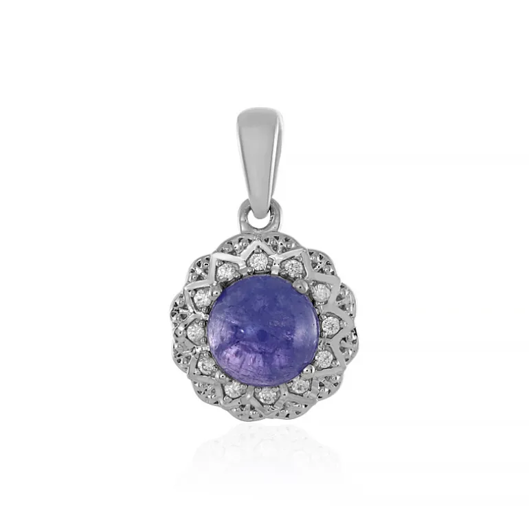 Dieser prächtige Anhänger ist mit einem wunderschönen runden Tansanit-Cabochon von 2,98 Karat aus Tansania besetzt, der von zwölf kambodschanischen Zirkonen von insgesamt 0,19 Karat umrahmt wird. Dieses exquisite Stück ist aus hochwertigem 925er Sterling Silber gefertigt und wiegt etwa 1,71 g. Seine Abmessungen von 23×14 mm machen ihn zu einem auffälligen Accessoire, das sich sowohl für formelle Anlässe als auch für schicke Freizeitlooks eignet. Verkörpern Sie Eleganz mit dieser strahlenden Ergänzung zu Ihrer Schmucksammlung.