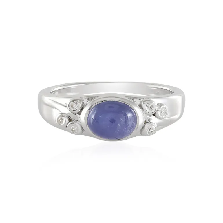 Dieser auffällige Ring präsentiert einen bezaubernden 1,566-karätigen Tansanit-Cabochon mit einem glatten ovalen Schliff, der elegant in 925er Sterling Silber gefasst ist. Seine Herkunft aus den Ausläufern des Kilimandscharo verleiht ihm Exklusivität, während sechs glitzernde kambodschanische Zirkon-Akzente von insgesamt 0,072 ct sein Funkeln verstärken. Das zeitgemäße Design sorgt für Vielseitigkeit und macht sie zum perfekten Accessoire sowohl für zwanglose Brunches als auch für formelle Anlässe. Lassen Sie dieses exquisite Stück Ihre Hand schmücken und verleihen Sie jeder Geste einen Hauch von Raffinesse.