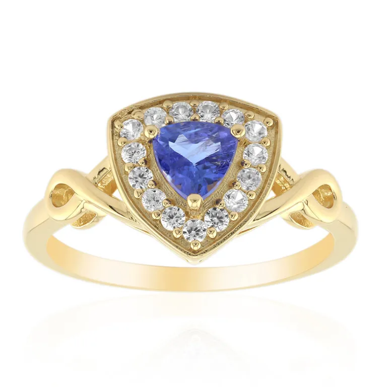 Tauchen Sie ein in die königliche Anziehungskraft dieses Rings aus vergoldetem 925er Sterlingsilber mit einem fesselnden Tansanit im Trillantschliff von 0,484 Karat aus den reichen Minen Tansanias. Ergänzt durch 15 glitzernde kambodschanische Zirkone im Rundschliff von insgesamt 0,371 ct verkörpert dieses exquisite Stück Raffinesse. Mit seinen Abmessungen von 22×19 mm ist es ein Statement, ohne zu überwältigen, und eignet sich sowohl für ein legeres Brunch als auch für elegante Abendveranstaltungen. Der leuchtend blaue Tansanit, der anmutig in einem Halo aus funkelnden Zirkonen platziert ist, bildet ein atemberaubendes Herzstück, das bei jeder Drehung das Licht einfängt. Lassen Sie diesen Ring den Hauch von Pracht sein, der jedes Ihrer Ensembles vervollständigt.