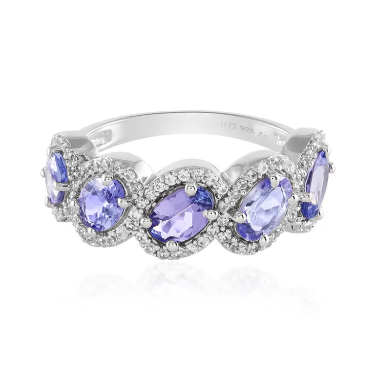Entdecken Sie die Faszination des tansanischen Tansanits mit diesem exquisiten Ring aus Sterlingsilber, der fünf Edelsteine im Ovalschliff von insgesamt 1,96 Karat enthält. Inmitten einer funkelnden Reihe von 86 kambodschanischen Zirkonen im Rundschliff strahlt dieses Stück einen luxuriösen Charme aus. Das platinierte 925er Silberband sorgt für Langlebigkeit und Glanz und macht es zu einer zeitlosen Ergänzung für jede Sammlung. Dieser Ring ist perfekt, um sowohl am Tag als auch am Abend einen Farbakzent zu setzen und zelebriert Eleganz mit einem modernen Twist.