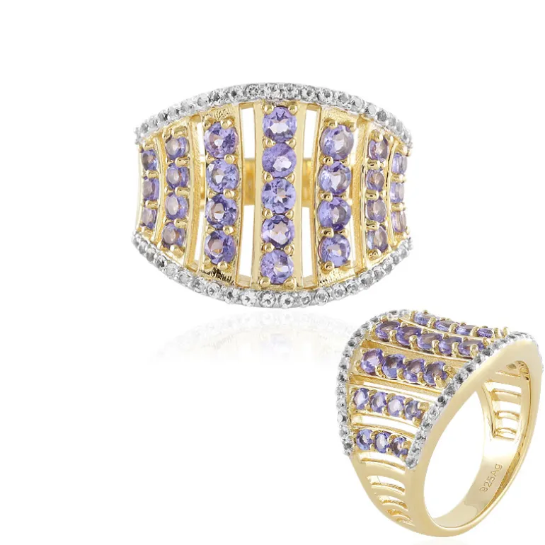 Entdecken Sie die Anziehungskraft dieses atemberaubenden Rings mit 27 Tansaniten im Rundschliff von insgesamt 1,197 ct aus Tansania, die mit 44 funkelnden indischen Weißtopasen von 0,378 ct besetzt sind. Das Schmuckstück ist aus 925er Sterlingsilber gefertigt und vergoldet und wiegt etwa 6,08 g. Es strahlt Eleganz aus. Perfekt für die Abendgarderobe oder besondere Anlässe, verleiht er jedem Outfit einen Hauch von Raffinesse und ist ein ideales Geschenk oder eine wertvolle Ergänzung Ihrer Schmucksammlung.