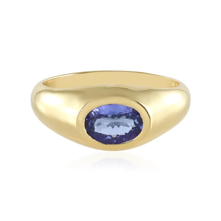 Entdecken Sie die Faszination dieses vergoldeten Rings aus Sterlingsilber mit einem atemberaubenden tansanischen Tansanit im Ovalschliff von 0,639 Karat. Das elegante Design verbindet einen modernen, 7×5 mm großen, lebhaften Edelstein mit der Wärme eines goldenen Farbtons. Dieser Ring ist ideal, um jedem Ensemble einen Hauch von Raffinesse zu verleihen, und eignet sich perfekt für besondere Anlässe oder als geschätztes Alltags-Accessoire. Mit seinem einzigartigen Charme und seiner strahlenden Farbe wertet er sowohl legere als auch formelle Outfits auf.
