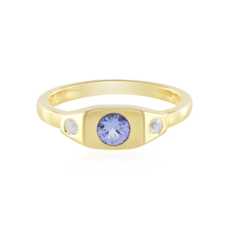 Entdecken Sie den Glanz dieses Rings aus vergoldetem 925er Sterlingsilber mit einem bezaubernden Tansanit von 0,231 Karat in der Mitte. Flankiert von zwei funkelnden weißen Topasen von insgesamt 0,09 ct aus Brasilien, kombiniert dieser Ring klassisches Design mit einem modernen Touch. Die Edelsteine im Rundschliff bieten eine zeitlose Eleganz, während der goldene Farbton einen Hauch von Wärme hinzufügt, was ihn zu einem idealen Accessoire macht, das sowohl tagsüber charmant als auch abends raffiniert ist. Kombinieren Sie dieses exquisite Stück mit Ihrem Lieblingskleid, um bei jedem gesellschaftlichen Ereignis einen unvergesslichen Eindruck zu hinterlassen.