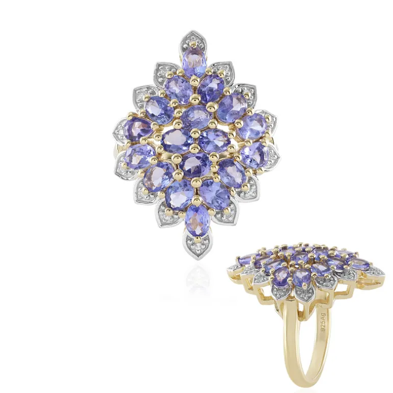 Dieser atemberaubende Ring besteht aus 16 oval geschliffenen Tansaniten von insgesamt 2,322 Karat, die von 2 tropfenförmigen Tansaniten und 14 weißen Topasen im Rundschliff aus Indien akzentuiert werden, gefasst in vergoldetem 925er Sterlingsilber. Mit einem Gesamtgewicht von 2,628 Karat strahlt der Ring mit dem bezaubernden blau-violetten Farbton des aus Tansania stammenden Tansanits. Er eignet sich perfekt, um Ihrer Abendgarderobe oder einem besonderen Anlass einen Hauch von Eleganz zu verleihen und ist eine exquisite Wahl für Sammler und Modebegeisterte gleichermaßen.
