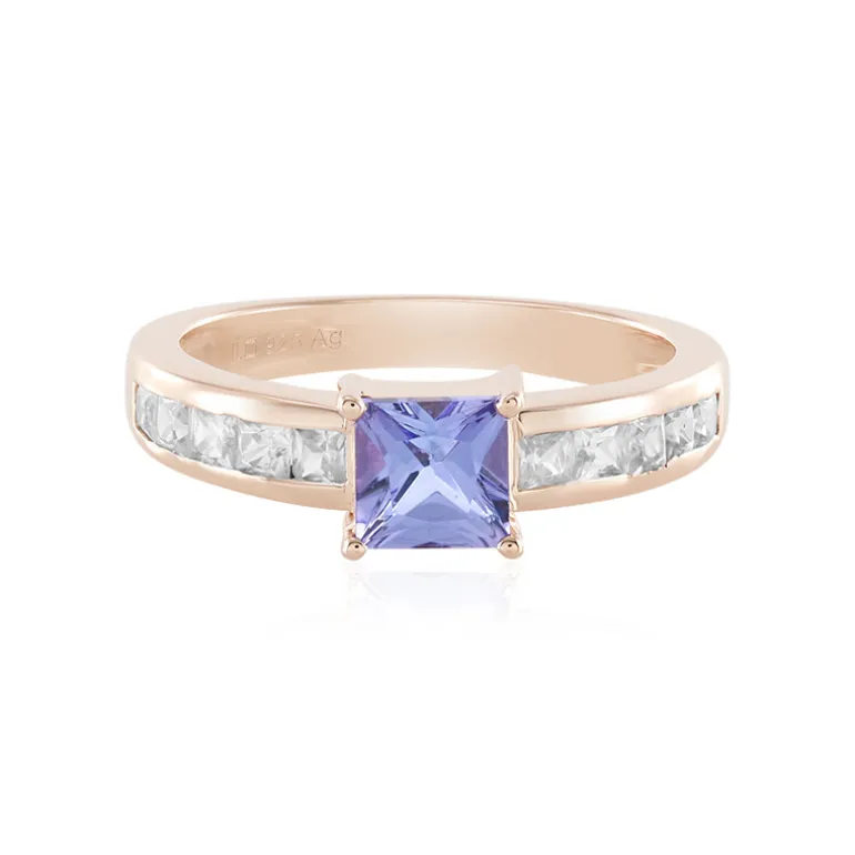 Dieser Ring aus rosévergoldetem Sterlingsilber hebt einen leuchtenden Tansanit von 0,585 Karat im Prinzessschliff aus Tansania hervor. Er wird von zehn schillernden Zirkonsteinen aus Kambodscha von insgesamt 0,63 Karat in einem raffinierten quadratischen Muster eingerahmt. Das schlichte Design des Rings eignet sich sowohl für formelle als auch für alltägliche Anlässe und macht ihn zu einer vielseitigen Ergänzung für jede Kollektion. Kombinieren Sie ihn mit pastellfarbenen oder neutralen Outfits für einen eleganten Touch bei Ihren besonderen Anlässen.