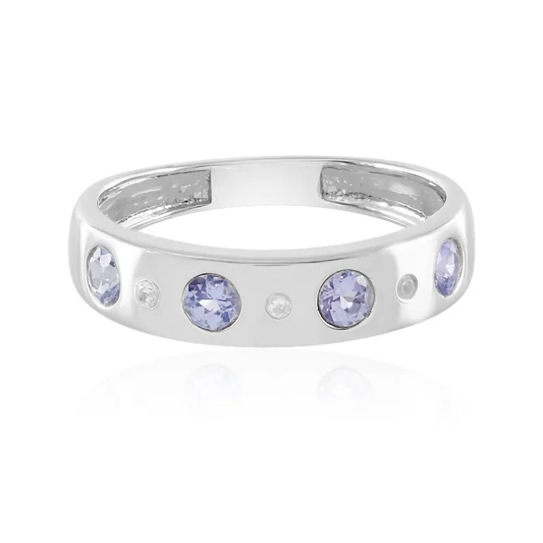 Entdecken Sie die Faszination tansanischer Edelsteine mit diesem elegant gearbeiteten Ring, der vier Tansanite im Rundschliff mit einem Gesamtgewicht von 0,385 ct enthält, die von funkelnden Zirkon-Akzenten mit einem Gewicht von 0,034 ct durchsetzt sind. Jeder Edelstein ist sorgfältig in platiniertes 925er Sterlingsilber mit einem Gewicht von ca. 2,12 g gefasst. Dieser Ring eignet sich perfekt, um jedem Ensemble einen Hauch von raffinierter Farbe zu verleihen, und bezaubert bei jeder Gelegenheit, vom täglichen Tragen bis hin zu besonderen Anlässen.