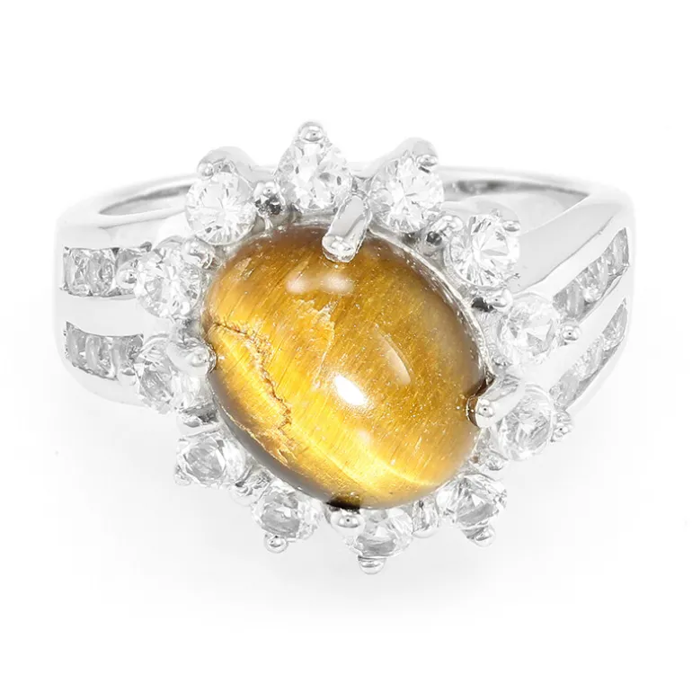 Entdecken Sie die Anziehungskraft dieses fesselnden Tigerauge-Silberrings, der einen glänzenden ovalen Cabochon von 3,17 Karat aus Südafrika präsentiert. Flankiert von funkelnden weißen Topasen mit einem Gesamtgewicht von 1,381 ct aus Brasilien, strahlt dieses Stück aus Sterlingsilber mit einem Gewicht von etwa 4,8 g Raffinesse aus. Sein einzigartiger goldbrauner Farbton und die schillernden Streifen machen ihn zu einem vielseitigen Accessoire, das sowohl zu legeren als auch zu formellen Anlässen passt und jedem Outfit einen eleganten Touch verleiht.