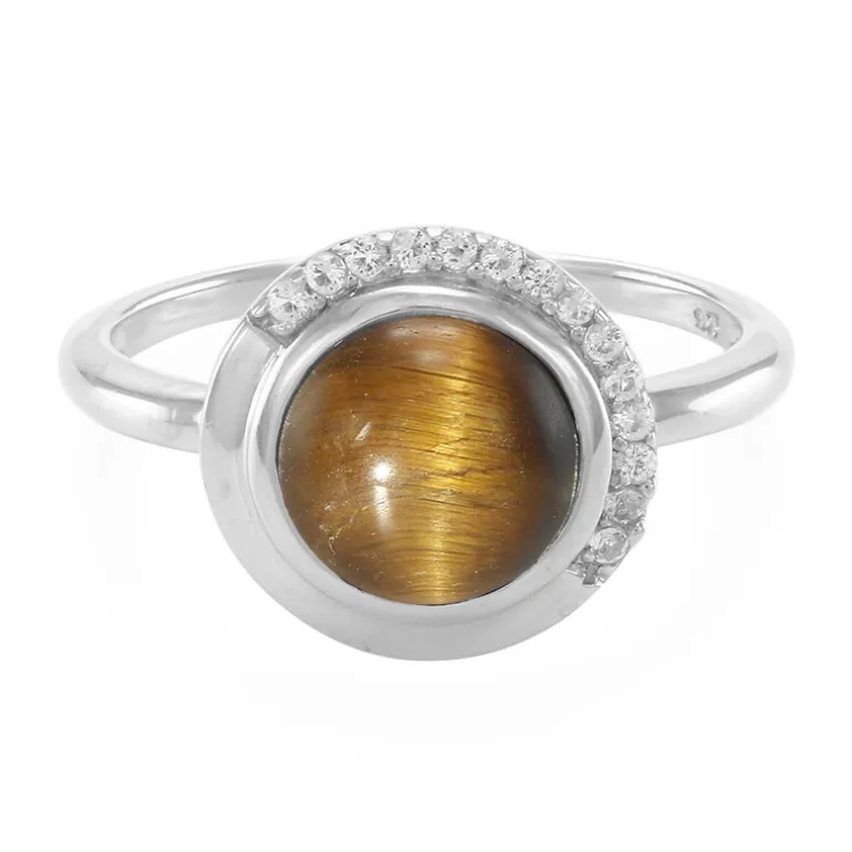 Entdecken Sie die fesselnde Anziehungskraft dieses Tigerauge-Silberrings mit einem atemberaubenden runden Tigerauge-Cabochon von 1,83 Karat aus Südafrika. Veredelt durch 14 funkelnde weiße Topase aus Brasilien, strahlt dieses Stück Eleganz und Raffinesse aus. Perfekt für legere und formelle Anlässe. Kombinieren Sie ihn mit einem schicken Abendkleid oder einem stilvollen Freizeitoutfit für einen Hauch von Eleganz.