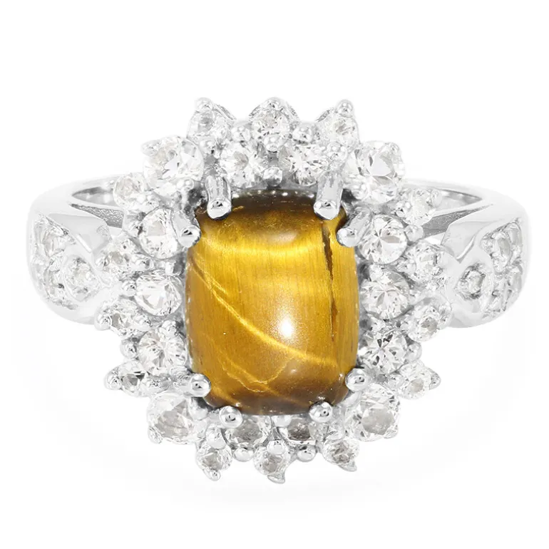 Dieser auffällige Ring besticht durch einen antiken Tigerauge-Cabochon von 2,17 Karat aus Südafrika, der von brillanten brasilianischen weißen Topas-Steinen umgeben ist. Der Ring ist aus elegantem 925er Sterlingsilber gefertigt und eignet sich sowohl für legere als auch für formelle Anlässe. Kombinieren Sie es mit einem schlichten schwarzen Kleid oder einer luxuriösen Robe, um seine lebendige Wärme und sein raffiniertes Funkeln zu unterstreichen.