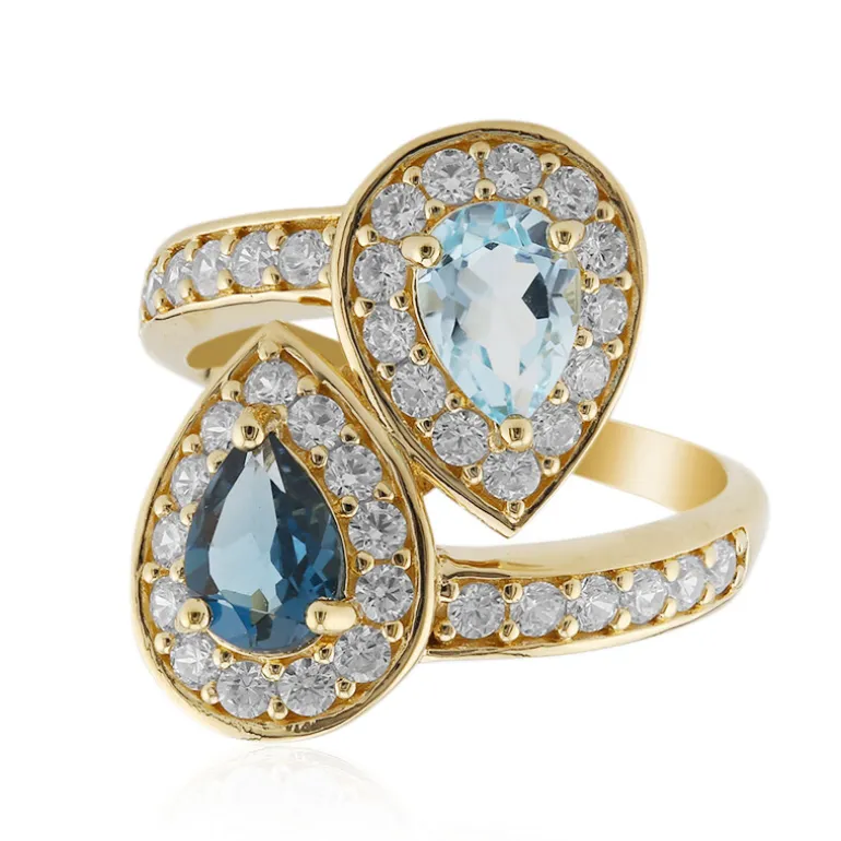 Dieser bezaubernde Ring aus vergoldetem Sterlingsilber zeigt die ruhige Schönheit eines brasilianischen Blautopas, der von einem Heiligenschein aus funkelnden Zirkonen aus Tansania ergänzt wird. Der tropfenförmige Schliff der zentralen Edelsteine unterstreicht ihre exquisite Farbe und Klarheit und bildet einen bezaubernden Kontrast zum goldenen Farbton des Rings. Mit einem Gesamtgewicht von 2,53 Karat ist dieser Ring die ideale Wahl für besondere Anlässe oder für einen Hauch von Eleganz im Alltag. Kombinieren Sie ihn mit einem klassischen Outfit und lassen Sie die leuchtenden Farben des Rings erstrahlen.