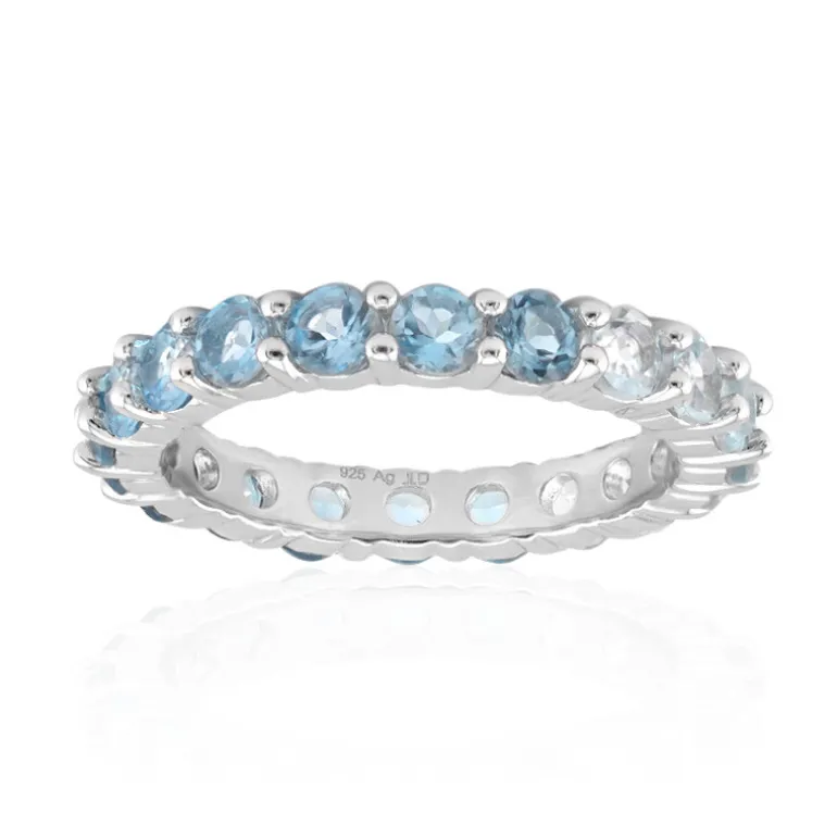 Entdecken Sie die bezaubernde Schönheit dieses Blautopas-Silberrings. Der Ring ist aus Sterlingsilber gefertigt und zeigt schillernde himmelblaue Topas-Steine, die einen schimmernden Kreis der Eleganz bilden. Dieser Ring eignet sich sowohl für den Alltag als auch für besondere Anlässe und verleiht jedem Outfit einen Hauch von raffiniertem Glanz. Kombinieren Sie ihn mit einem eleganten Abendkleid für einen schicken Look, oder tragen Sie ihn leger, um Ihren täglichen Stil aufzuwerten.