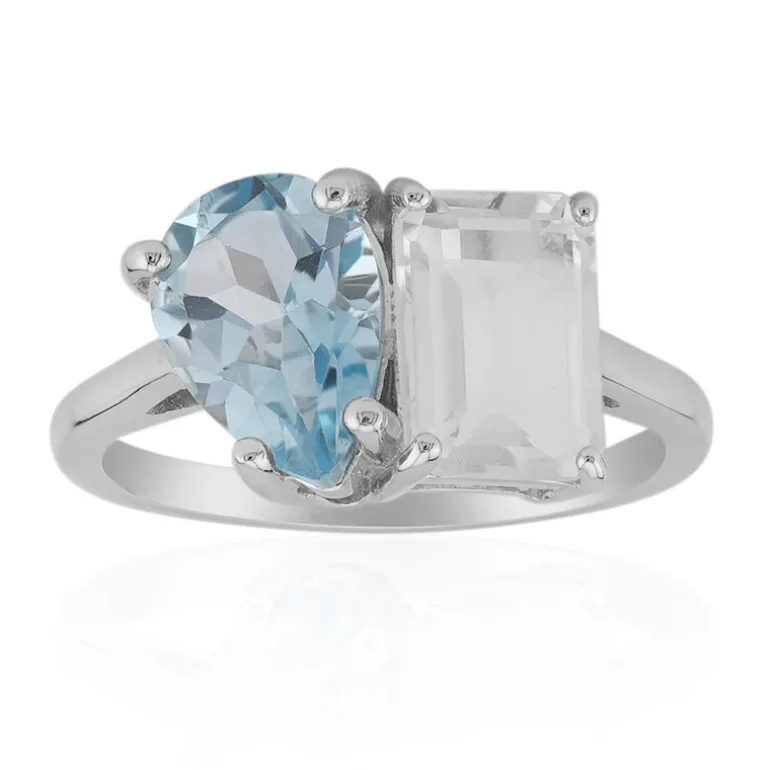 Dieser atemberaubende Ring zeigt einen bezaubernden himmelblauen Topas aus Brasilien im Birnenschliff mit einem Gewicht von 1,935 Karat neben einem unberührten weißen Topas aus Nigeria, der in einem eleganten Achteck geschliffen ist und ebenfalls 1,935 Karat wiegt. Der Doppelstein ist in hochwertigem 925er Sterlingsilber gefasst und wiegt insgesamt 3,87 Karat. Die einzigartige Fassung mit zwei Steinen ist eine moderne Variante der klassischen Eleganz und eignet sich sowohl für die Freizeit als auch für formelle Anlässe. Verzaubern Sie Ihr Outfit mit diesem vielseitigen Schmuckstück.