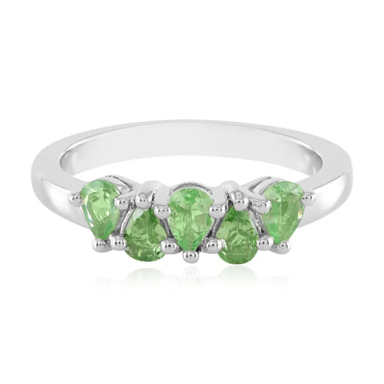 Entdecken Sie den lebendigen Charme unseres tansanischen Tsavorit-Rings. Dieses exquisite Stück besteht aus 0,637 Karat Tsavorit im Tropfenschliff, der einen satten grünen Farbton aufweist. Jeder der fünf Edelsteine ist meisterhaft in 925er Sterlingsilber mit einer luxuriösen Platinplattierung gefasst, die Langlebigkeit und Glanz garantiert. Mit einem Gewicht von ca. 2,76 Gramm präsentiert der Ring ein modernes und doch zeitloses Design, das sich perfekt eignet, um einen Farbtupfer in Ihr Alltagsoutfit zu bringen oder einen formelleren Look zu vervollständigen.
