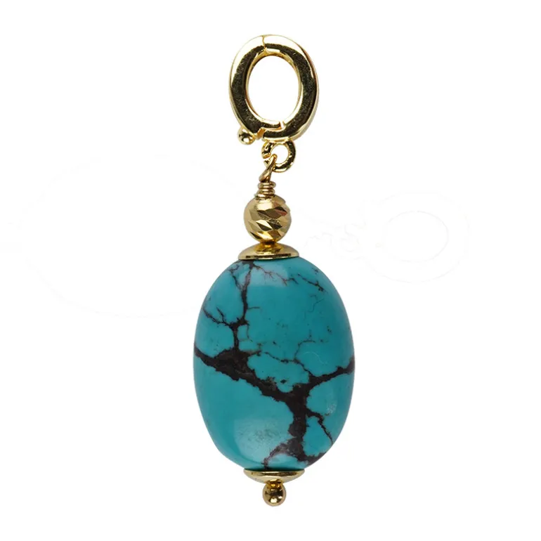 Entdecken Sie die lebendige Anziehungskraft unseres handverlesenen chinesischen Türkisanhängers. Dieses elegante Schmuckstück verfügt über eine ovale 13-karätige Türkisperle mit einer auffälligen Matrix, die durch den warmen Glanz von 925er Sterlingsilber mit einer luxuriösen Vergoldung hervorgehoben wird und etwa 0,95 Gramm wiegt. Sein vielseitiges Varioclip-Design ermöglicht eine einfache Befestigung an Ketten und Armbändern und macht ihn zu einer anpassungsfähigen Ergänzung für jede Sammlung. Dieser Anhänger ist ideal, um Ihrem Ensemble einen Hauch von Farbe zu verleihen. Er ist ein wunderschönes Statement-Stück, das jedes Tages- oder Abendoutfit vervollständigt.