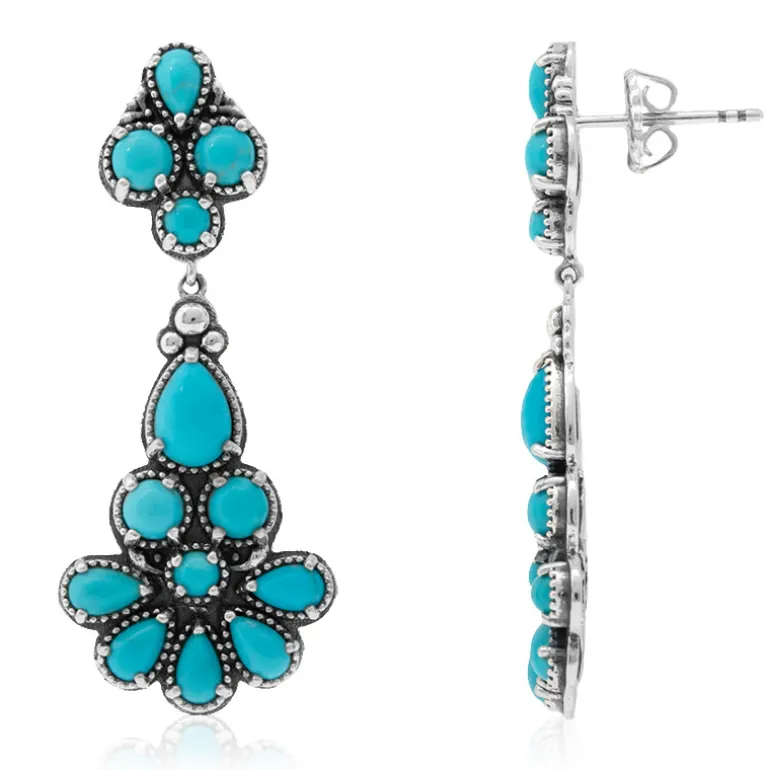 Die Desert Chic Turquoise Silver Earrings versprühen einen Hauch von Bohème. Mit exquisiten Türkisen aus den USA in tropfenförmigen und runden Cabochons fangen diese Ohrringe den lebendigen Geist von Wüstenlandschaften ein. Das detailreiche Sterlingsilber unterstreicht die Schönheit der Türkise und macht die Ohrringe zu einem Blickfang für jede Gelegenheit – perfekt für legere Outfits oder einen Abend im Freien.