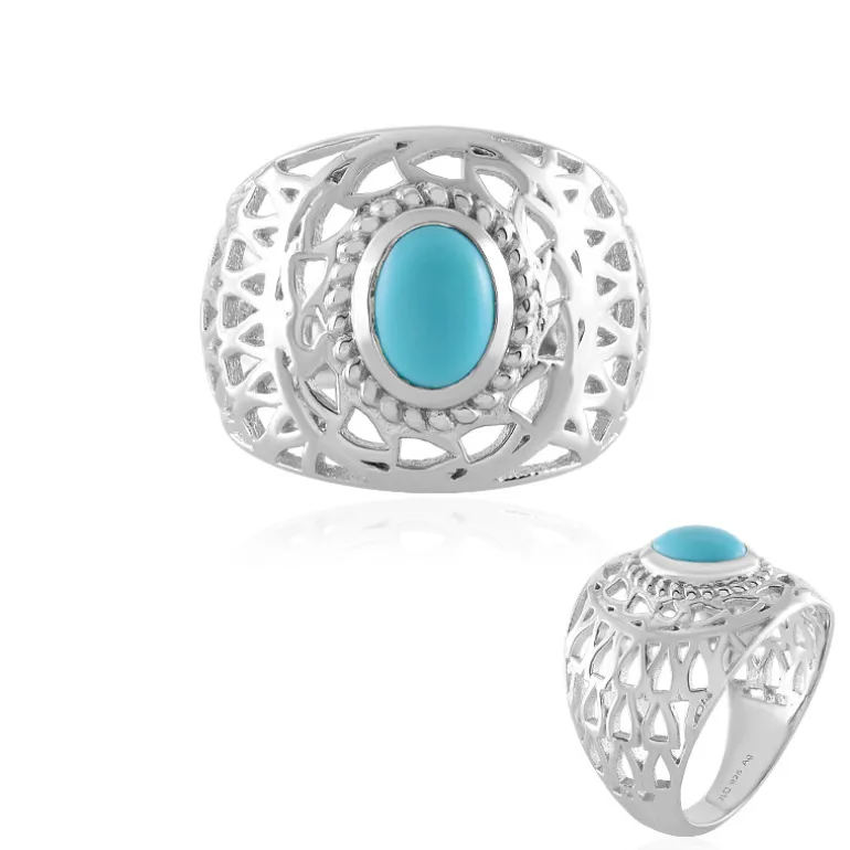 Entdecken Sie die Anziehungskraft dieses auffälligen Rings mit einem 1,018-karätigen Türkis aus den USA, der fachmännisch in einen ovalen Cabochon geschliffen und in 925er Sterling Silber gefasst ist, das platiniert wurde. Mit seinem faszinierenden himmelblauen Farbton, der das komplizierte Gitterdesign ergänzt, ist dieses Schmuckstück perfekt geeignet, um Ihrer Alltagsgarderobe einen Farbakzent zu verleihen oder bei besonderen Anlässen ein Statement abzugeben.